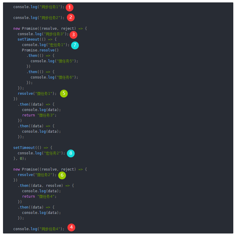 但是需要注意的是,上面执行到标号5时又不一样了,宏任务一执行后又产生了新的微任务,所以宏任务两个并没有顺利连续执行,而是被插入的微任务拦住了。