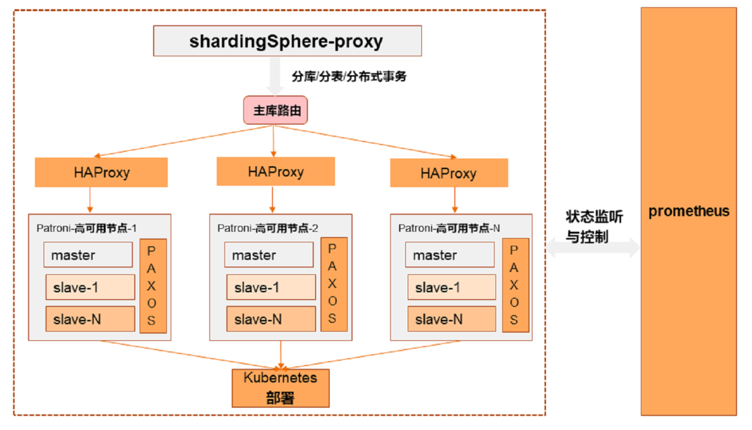 本分布式方案运用 ShardingSphere-Proxy 强劲的分布式能力,通过 kubernetes 管理集群,prometheus 监控集群状态,从而构建全栈开源的分布式解决方案。
