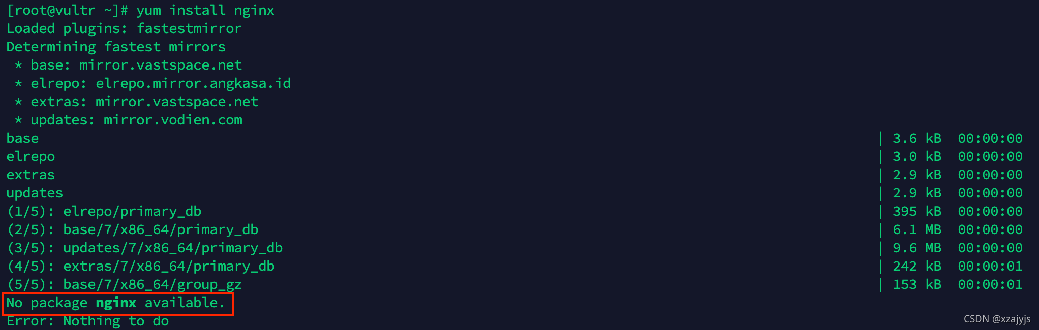 这里就出现了第一个问题,因为nginx并不在centos的官方源中,因此直接安装会提示找不到nginx安装包