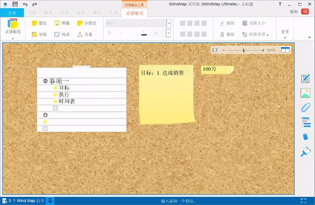 iMindMap的灵感视图,顾名思义,就是能促进用户发散思维,激发灵感的一种思维导图形式。如图5所示,用户可以通过列举事项、列举想法等形式,对一个事项进行发散讨论,同时使用想法工具,将讨论的要点记录下来。