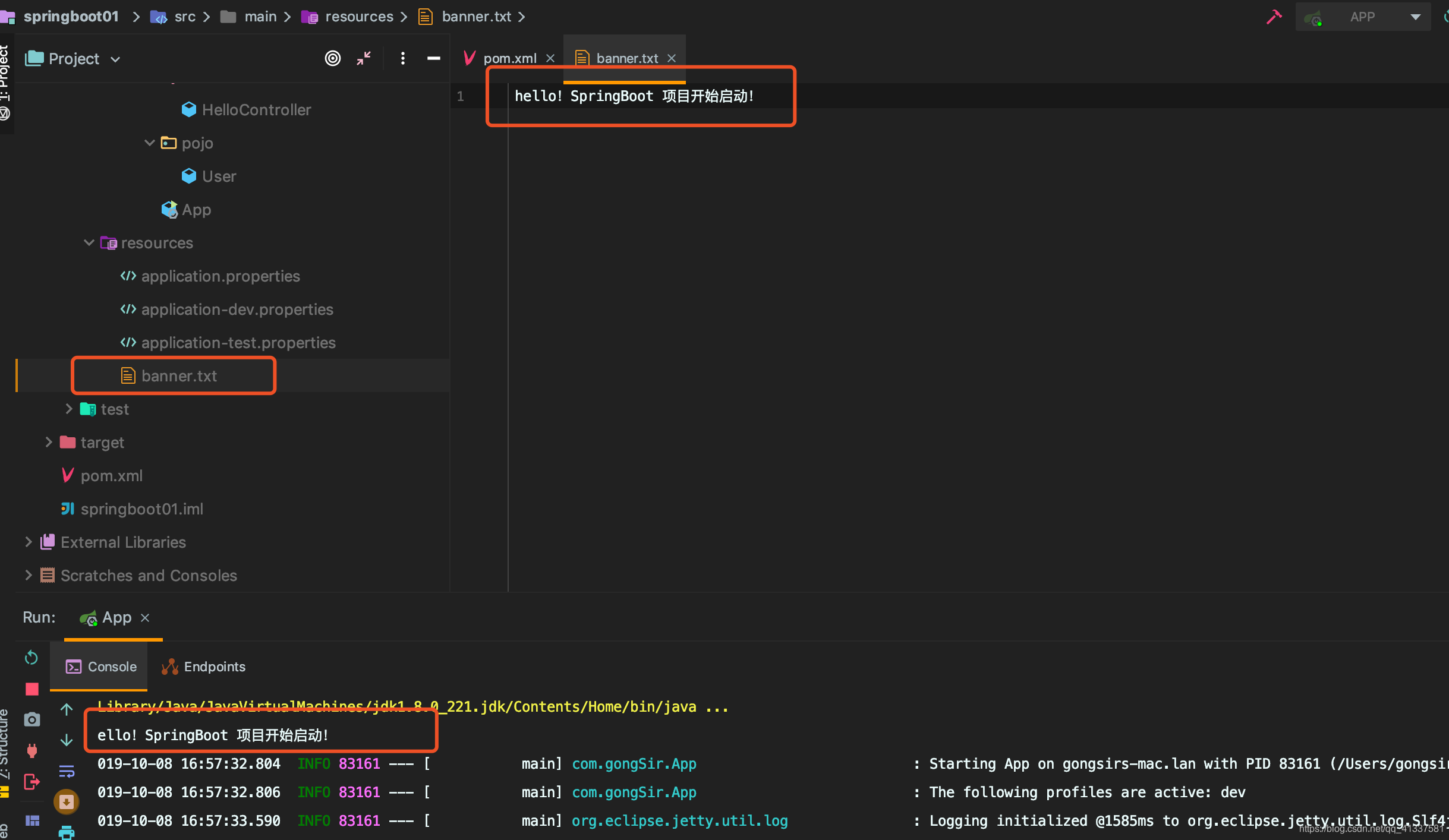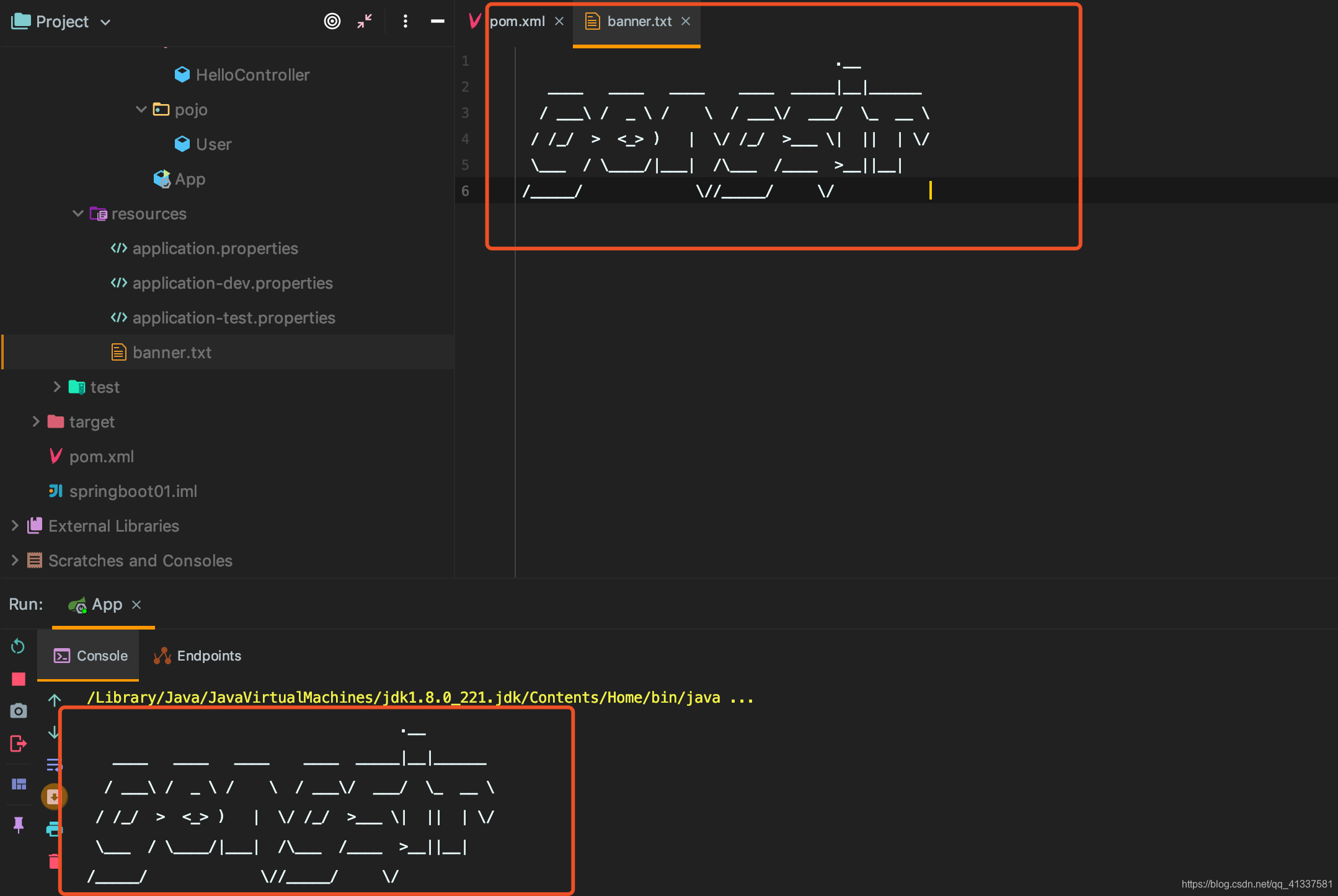 在resource目录下新建一个banner.txt文件,把想打印的字符保存在这个TXT里面,SpringBoot启动时,就会打印出来: