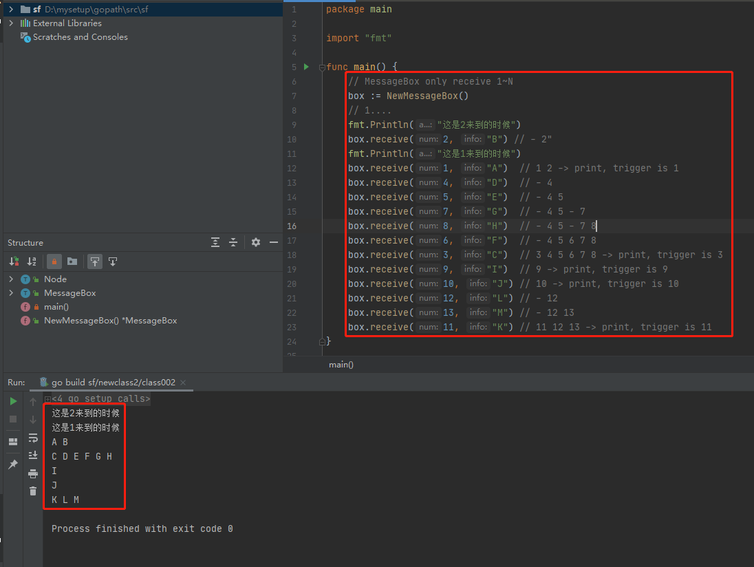 box.receive(11, "K") // 11 12 13 -> print, trigger is 11
