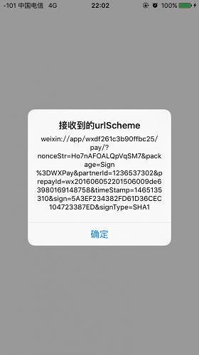 UIAlertView *alert = [[UIAlertView alloc]initWithTitle:@"接收到的urlScheme" message:url.absoluteString delegate:nil cancelButtonTitle:nil otherButtonTitles:@"确定", nil];