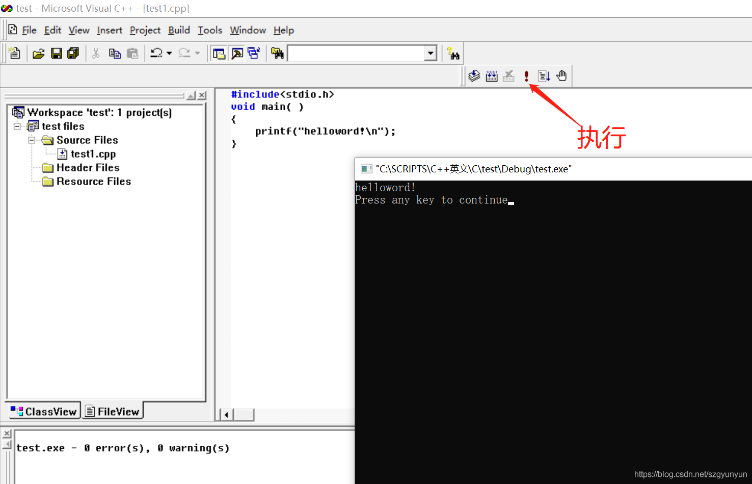 链接成功之后即可运行程序。在主菜单栏中选择“Build”菜单项,在弹出的子菜单中选择 “Execute HelloWorld.exe”命令,或者单击工具栏中的“Execute Program”按钮。