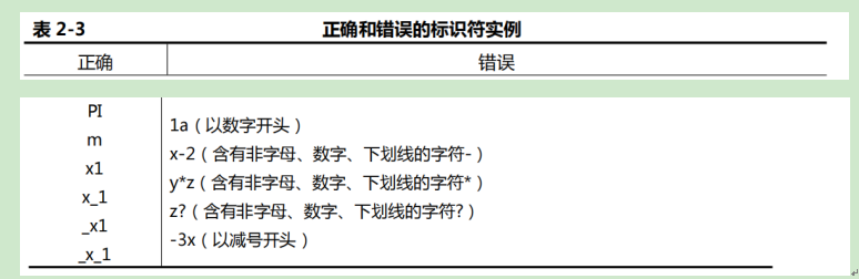 C 语言规定,用户标识符仅由大小写英文字母、数字和下画线组成,且第一个字符不能是数字。 下面给出一些正确和错误的标识符实例,如表 2-3 所示。