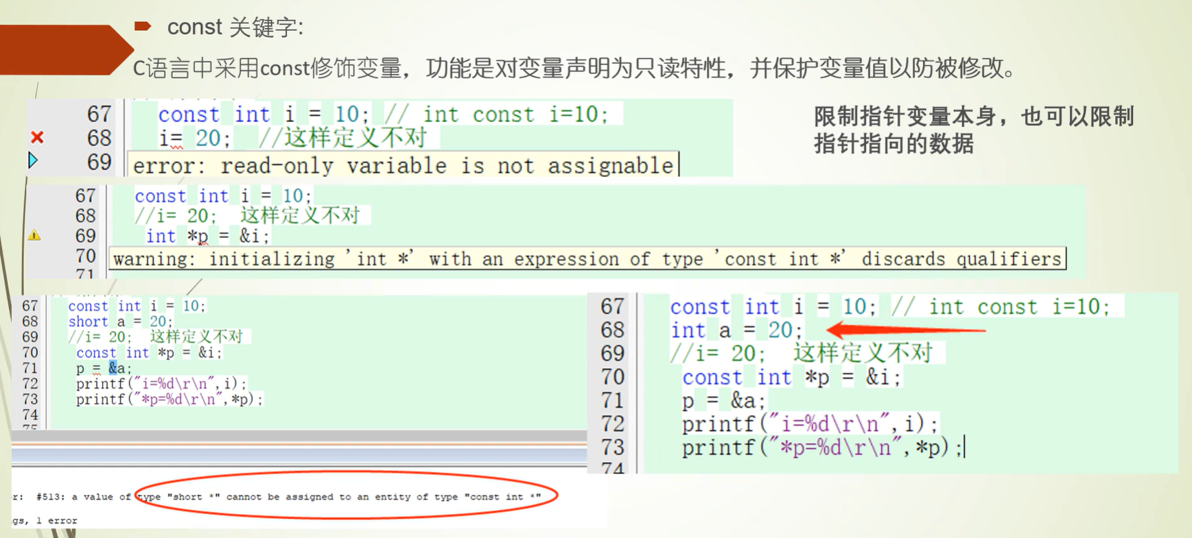 C语言中const关键字的作用: 修饰局部变量或者全局变量,表示变量n的值不能被改变了 修饰指针,分为常量指针与指针常量,也可以两者结合 常量指针指向的值不能改变,但是这并不是意味着指针本身不能改变, ...