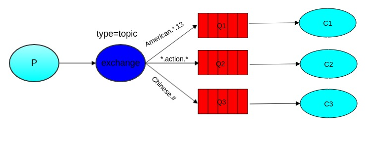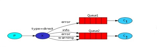 如图中RoutingKey分别是error、info、warning,其中error被Binding(绑定)到queue1和queue2上,info和warning被Binding到queue2上。当消息的RoutingKey是error,这条消息将被投递到queue1和queue2中(相当于消息被复制成两个分别投放到两个queue中),然后分别被Consumer1和Consumer2处理。如果消息的RoutingKey是info或者warning,这条消息只会被投递到queue2中,然后被Consumer2处理。如果消息的RoutingKey是其他的字符串,这条消息则会被丢弃。