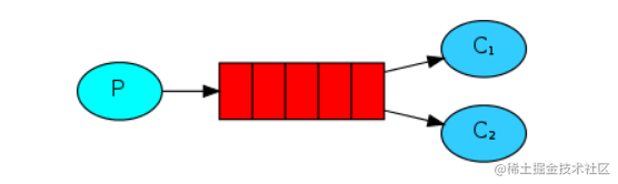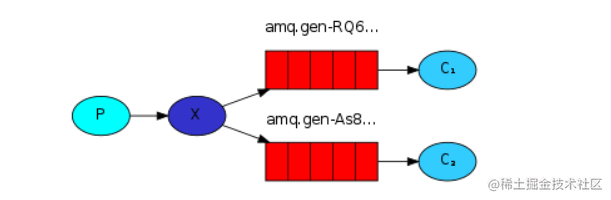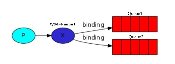 如图中,没有RoutingKey的限制,只要消息到达Exchange,都会被投递到queue1和queue2中,然后被对应的Consumer处理。