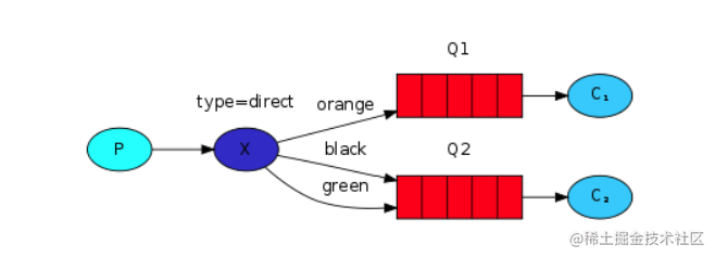 (3)作用描述:根据Binding指定的Routing Key,将符合Key的消息发送到Binding的Queue。可以构建点对点消息传输模型。