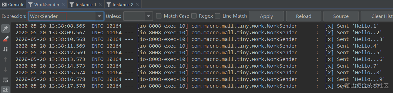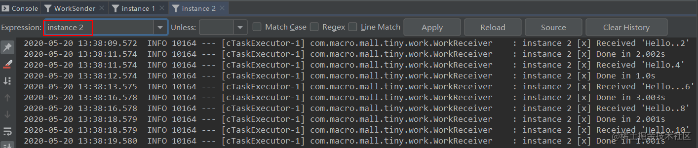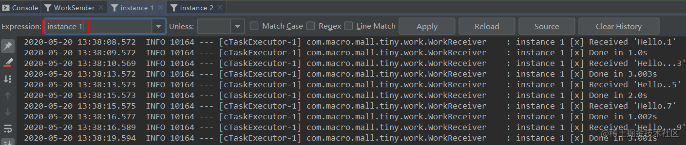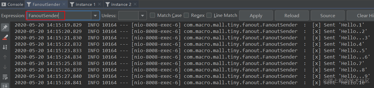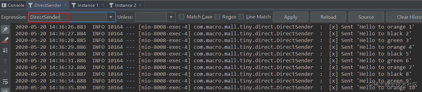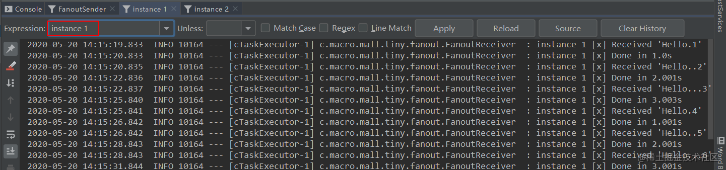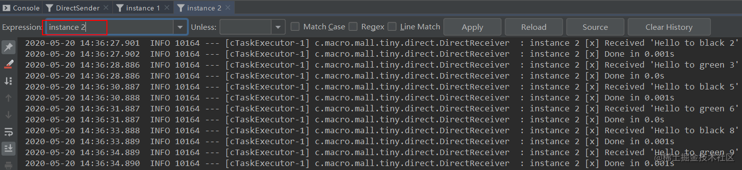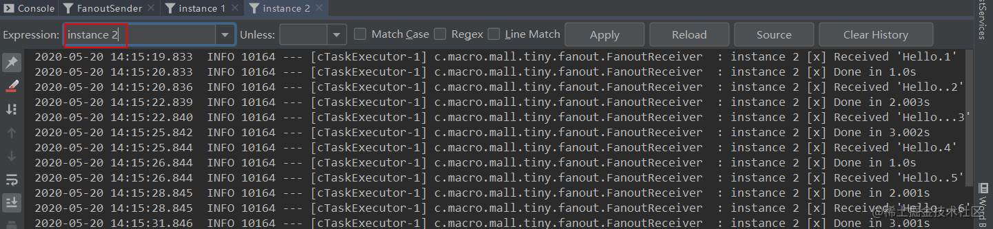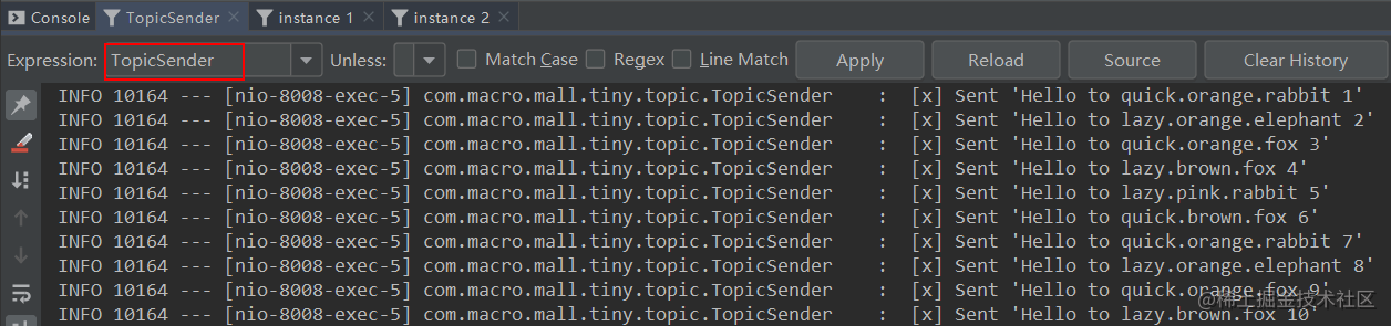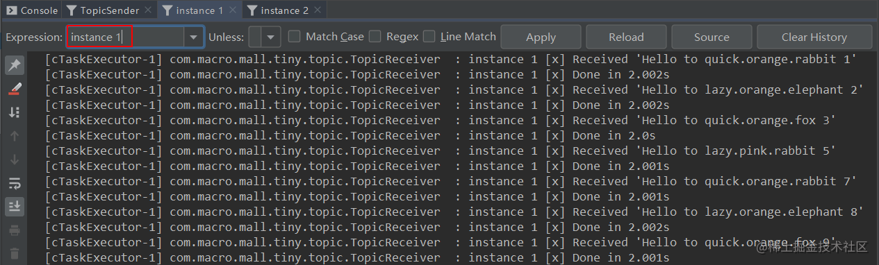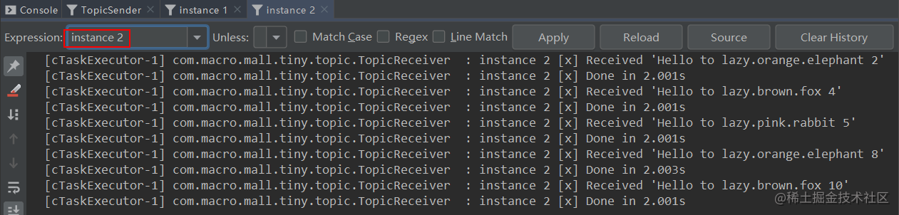 路由键的消息,instance 1和instance 2分别获取到了匹配的消息。