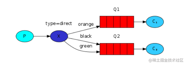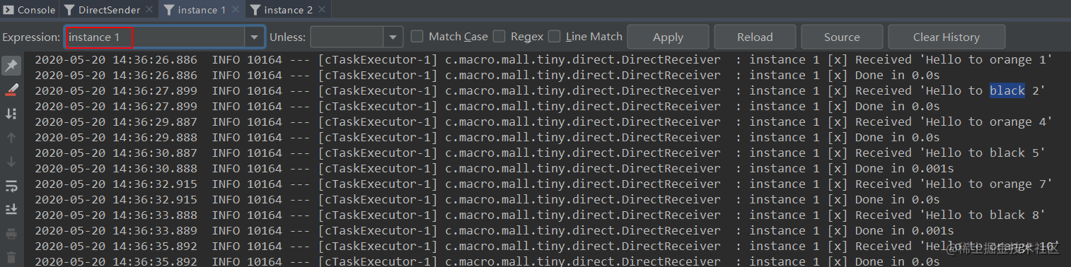 路由键的消息,instance 1获取到了orange和black消息,instance 2获取到了green和black消息。
