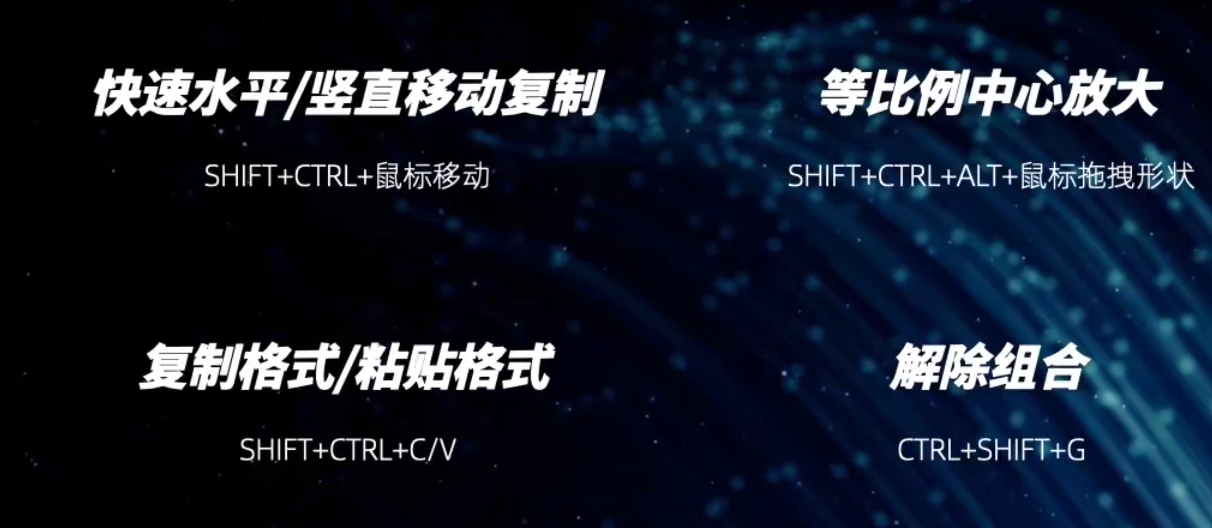 CTRL+G:组合,两个如果只是选中,同时放大时,中间的距离会有影响。而使用组合后放大则中间的空间不受影响