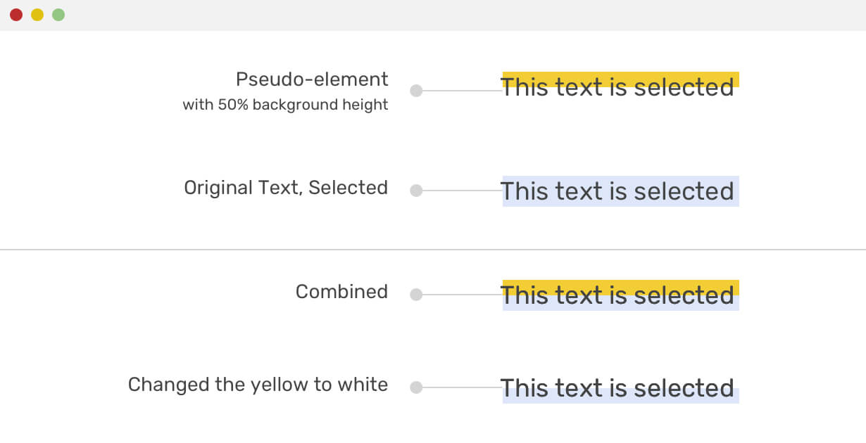 现在,选择文本后,伪元素将垂直覆盖文本的50%。这模仿了我们所需的效果。