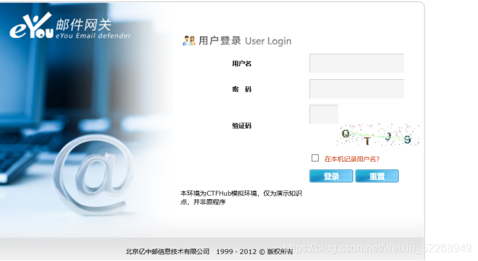 打开靶机 查看页面内容 根据题目提示,去搜索北京亿中邮信息技术有限公司邮件网关的默认口令 尝试登录 成功拿到flag