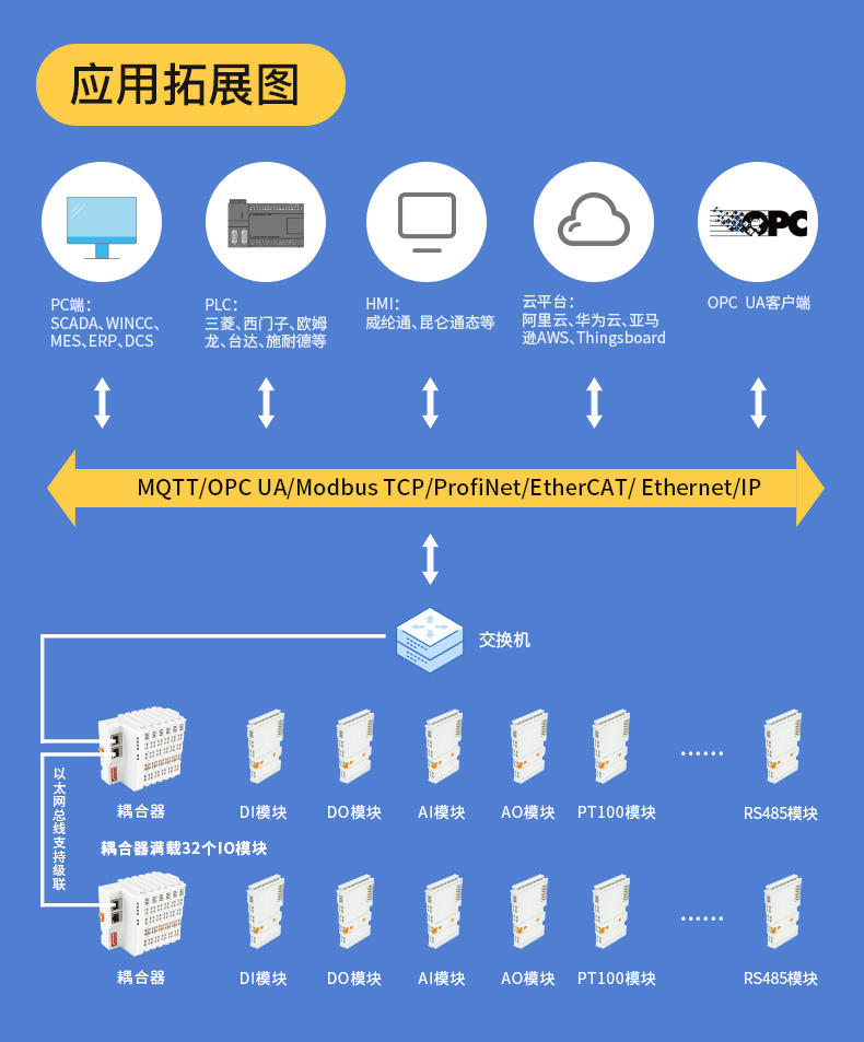 BL200系列分布式IO系统,适用于大点数集中控制的应用场景,采用耦合器和I/O模块结构,用户可以根据需求自行选择I/O模块。耦合器可挂载多达32个IO模块,采用10MHz高速背板总线通讯,模块提供丰富的I/O接口类型如:AI、AO、DI、DO、PT100、RS485,提供2个RJ45以太网接口,可以实现级联。目前分布式IO系统支持MQTT、OPC UA、Modbus TCP、ProfiNet、EtherCAT、 EtherNet/IP等总线通讯协议。