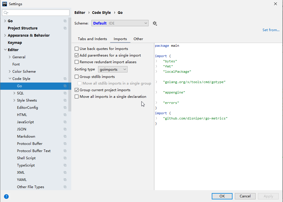 打开设置:Editor > Code Style > Go,选择import标签,将排序改为