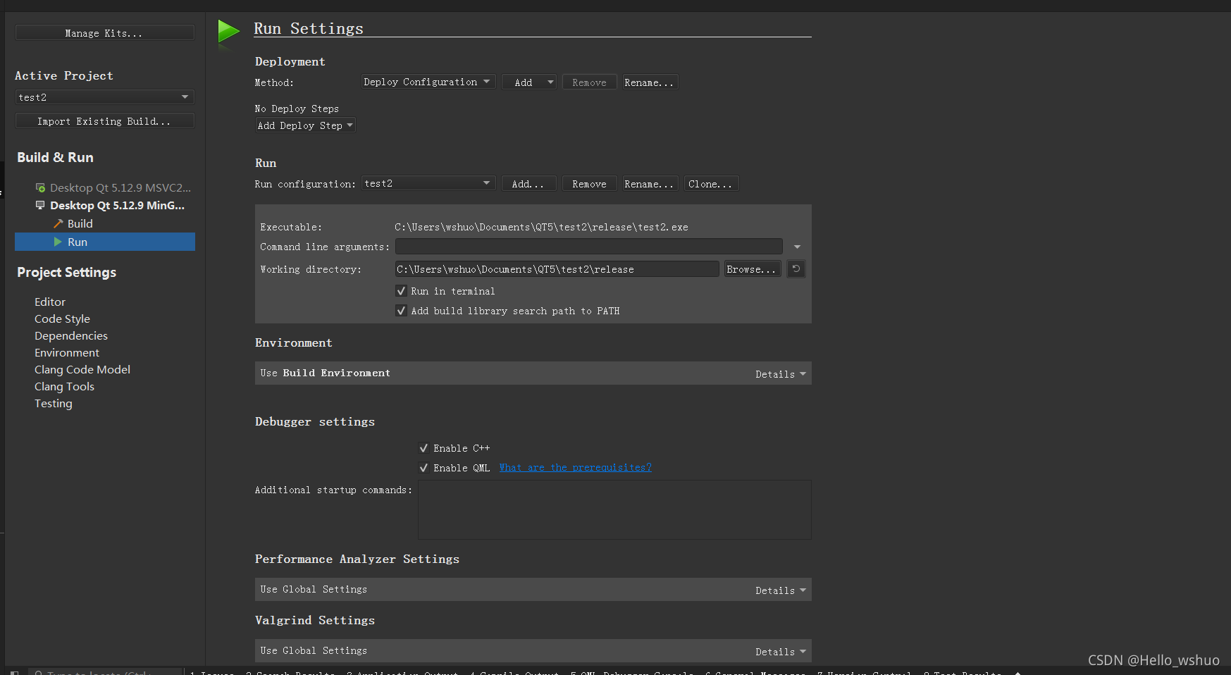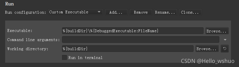 Executable: 可执行文件位置(内容应该随着选择debug和release而修改),如要修改可以点击 Run Configuration:的add