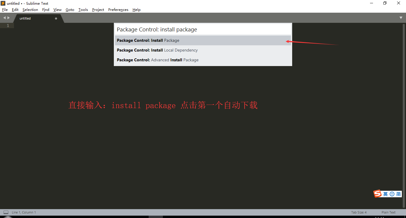 Preferences->Package Control,直接输入install package选择点击第一个自动安装,大概两三分钟后下载完成(根据你网速而定),弹出install package的输入框;
