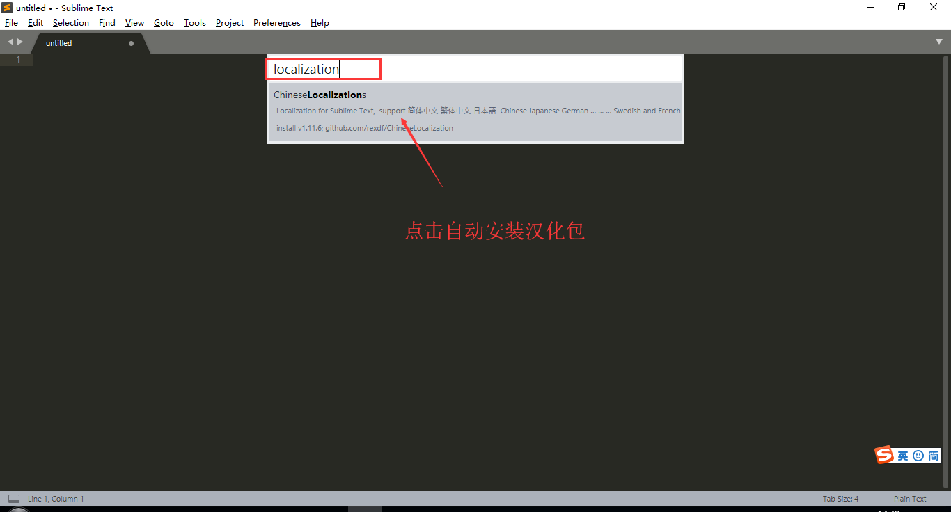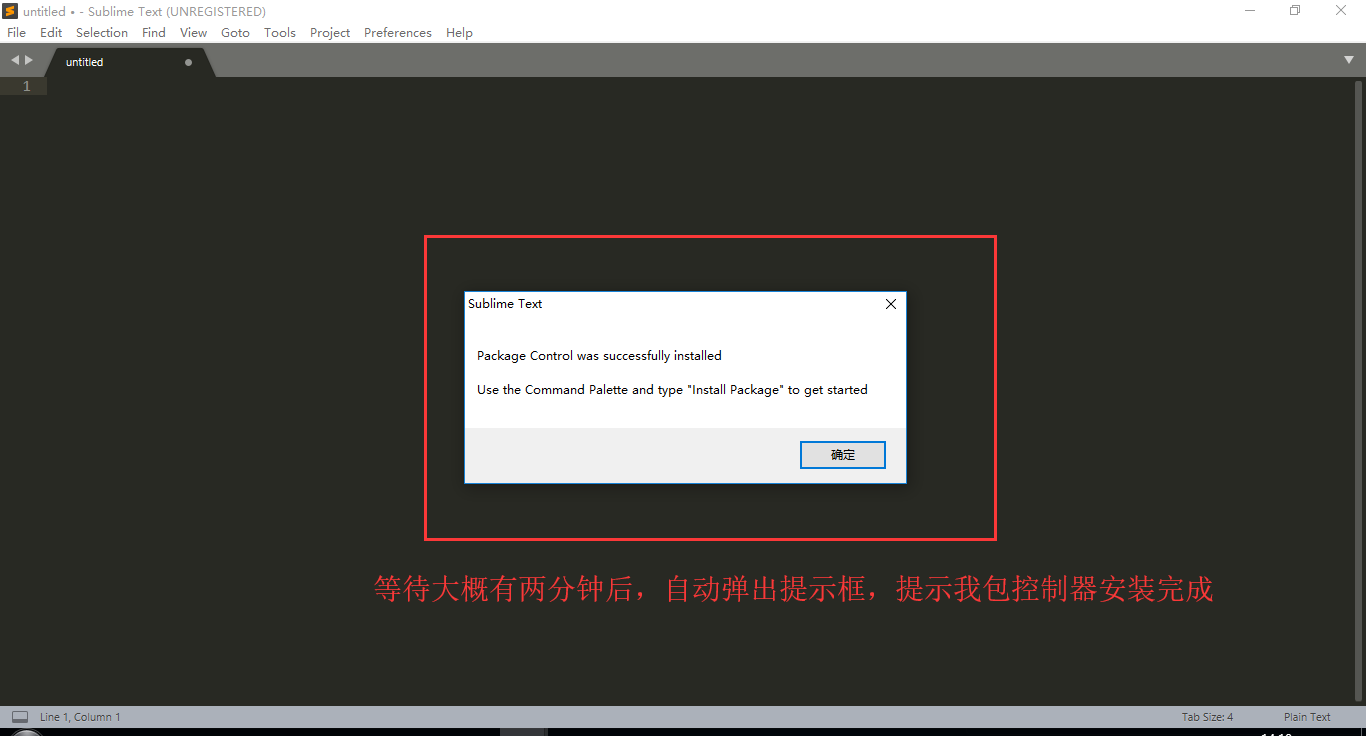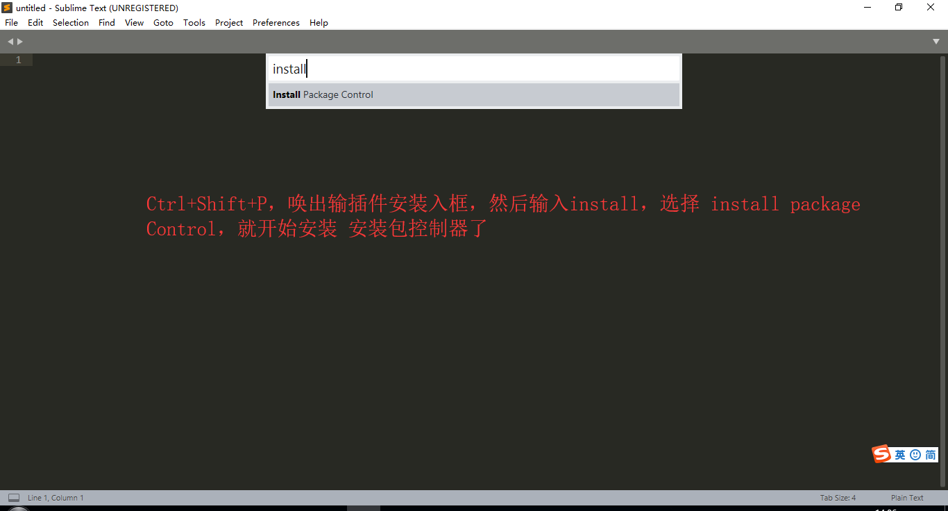 Ctrl+Shift+P唤起命令调色板,输入install点击Install Package Control,稍等2分钟后提示安装成