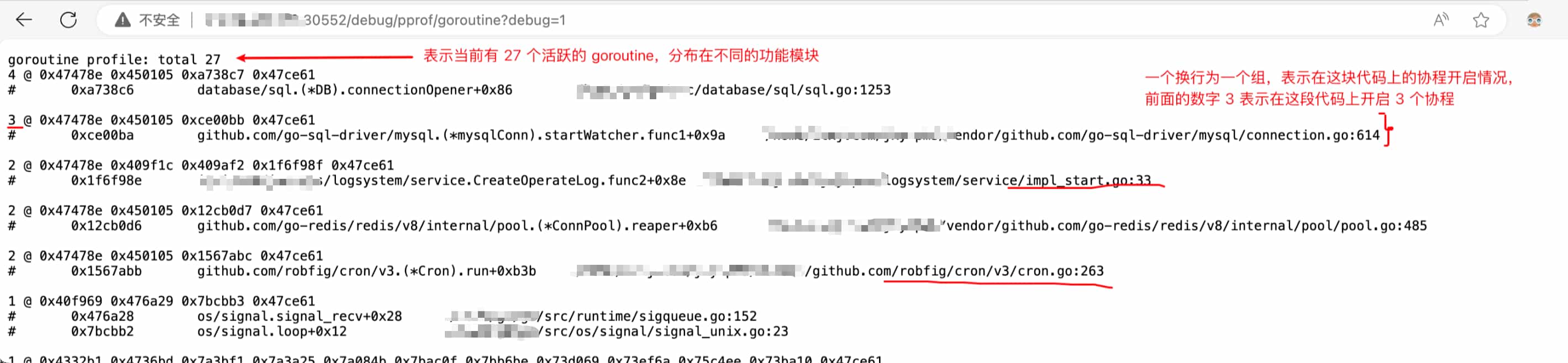 http://0.0.0.0:30552/debug/pprof/goroutine?debug=1 # 协程的具体阻塞堆栈情况