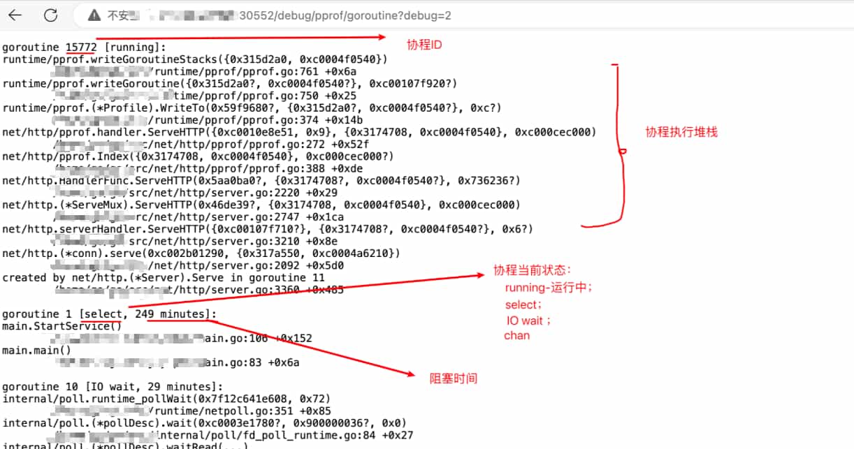 http://0.0.0.0:30552/debug/pprof/goroutine?debug=2 # 协程的具体阻塞堆栈情况