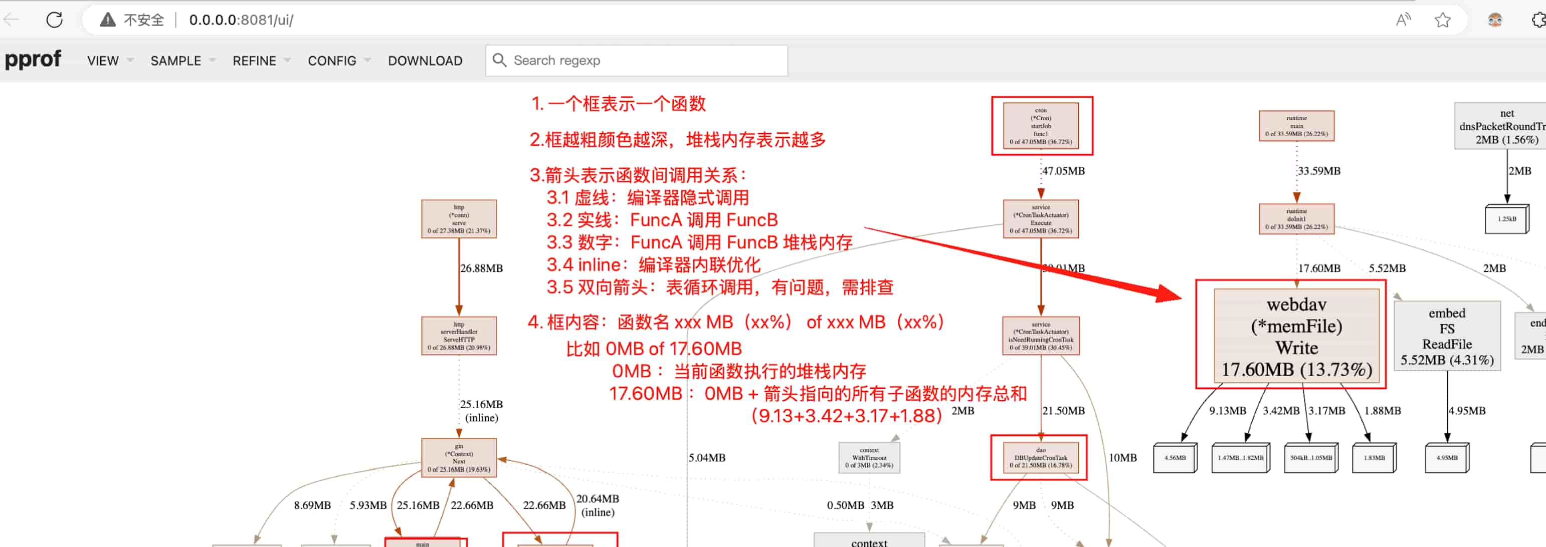 http://0.0.0.0:30552/debug/pprof/heap?debug=1 # 内存堆栈分析(哪些函数一直占用内存)