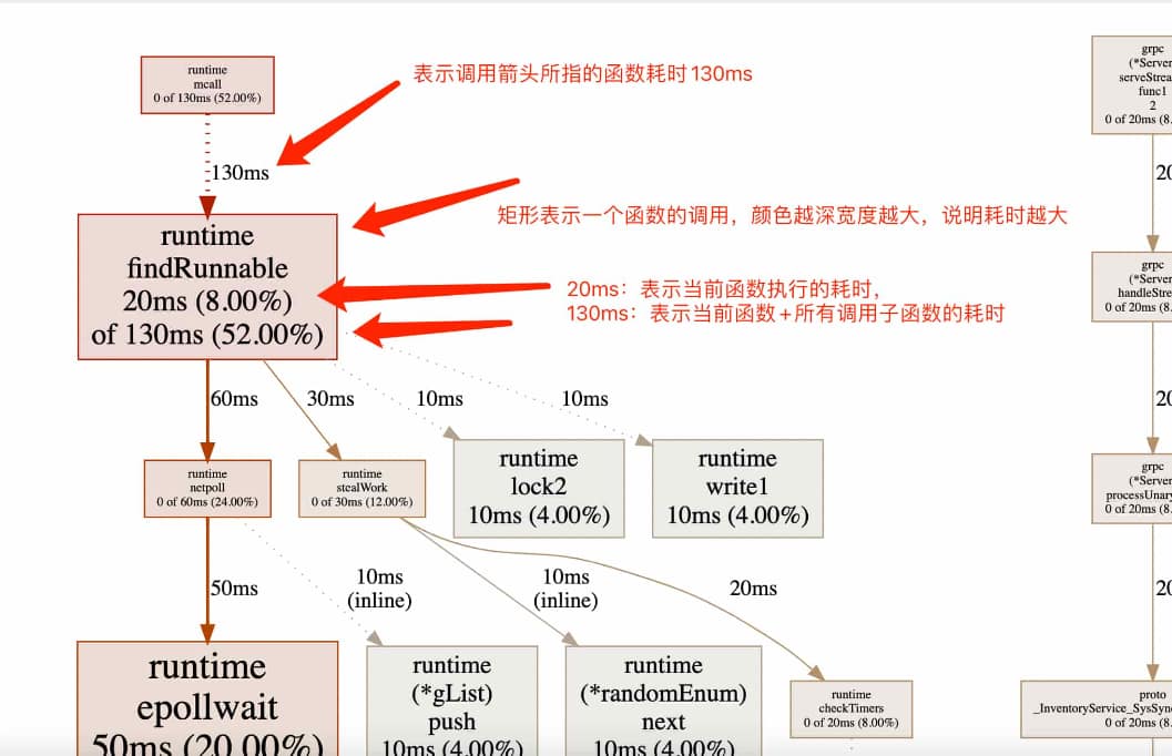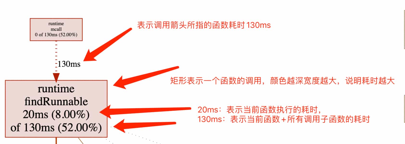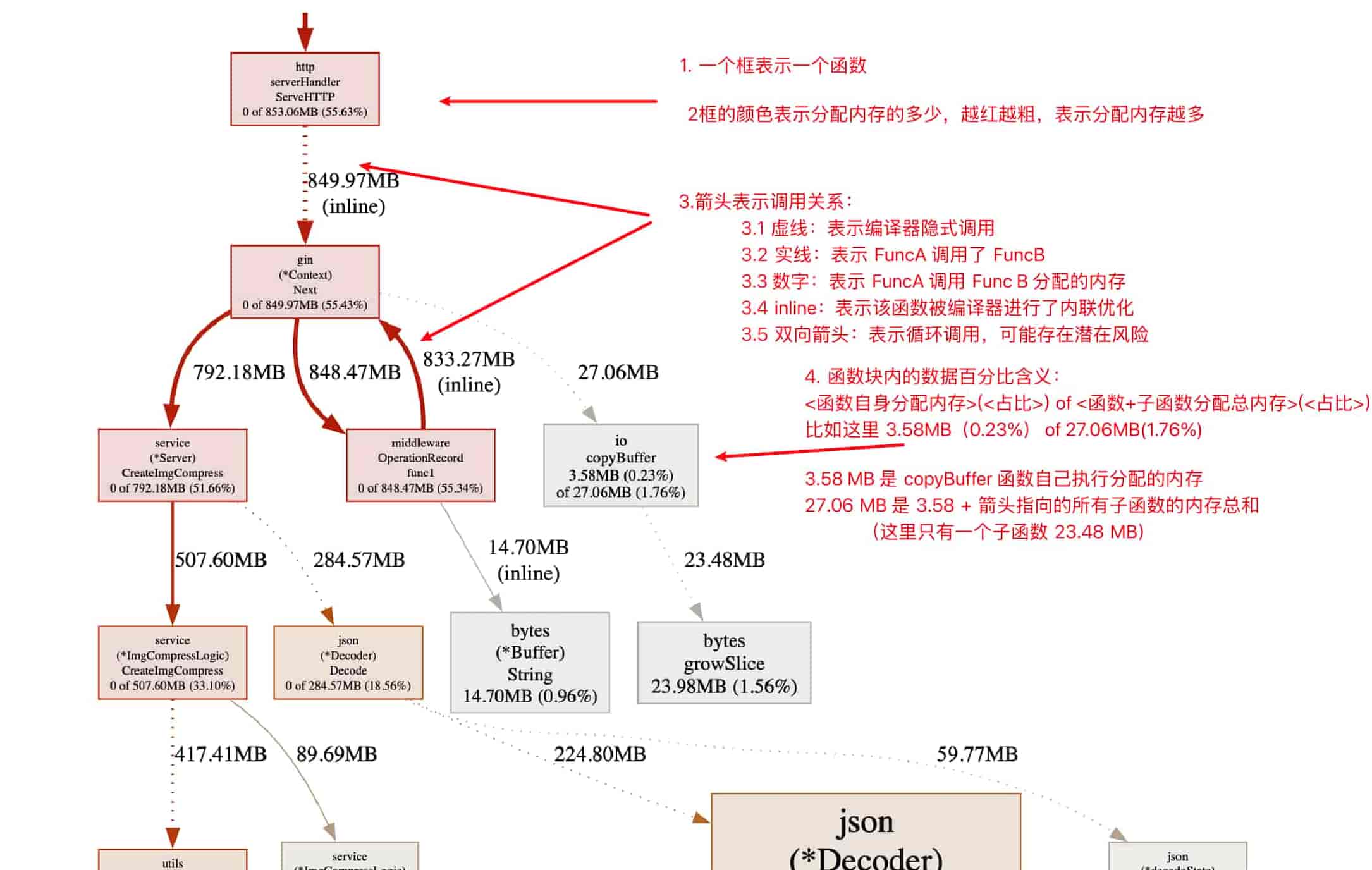 示例 含义 普通调用箭头 FuncA ──→ FuncB显示函数直接调用关系 带资源分配标签的箭头 FuncA ── 50ms → FuncBFuncA 调用 FuncB 的过程中耗时 50ms 虚箭头/虚线箭头 FuncA ···→ runtime.mallocgc编译器隐式插入的耗时操作 双向箭头 FuncA <──> FuncB 相互调用,循环调用,这种可能存在潜在风险 (inline):表示该函数在编译时被内联优化 (Inlining)处理了