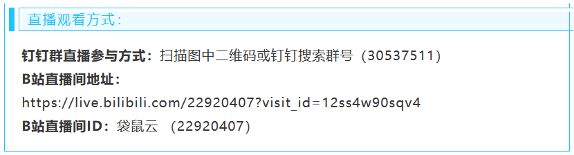 本次活动将会在钉钉群和B站同步直播,欢迎大家准时参加!