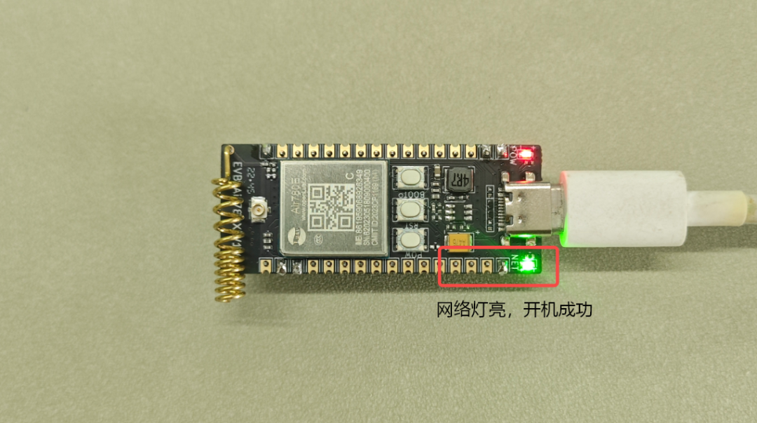 此时按下开机键,约2秒后释放,等待几秒网络指示绿灯常亮,即开机成功,如下图: