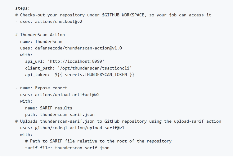ThunderScanSAST具有专用的REST API客户端,可通过带有参数的GitHub Action调用该客户端,以对目标存储库运行分析。