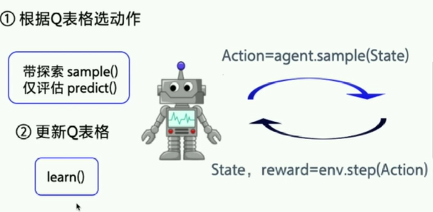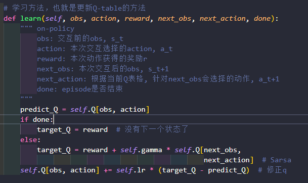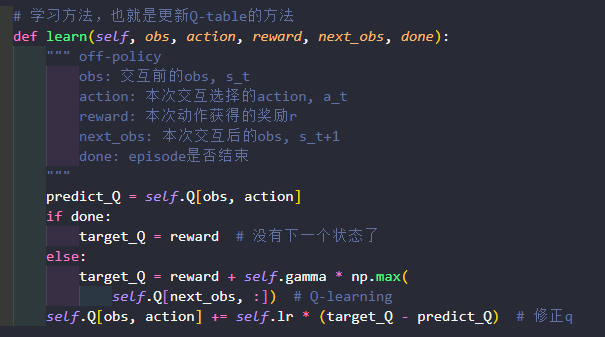 Agent是和环境environment交互的主体。predict()方法:输入观察值observation(或者说状态state),输出动作值sample()方法:再predict()方法基础上使用ε-greedy增加探索learn()方法:输入训练数据,完成一轮Q表格的更新