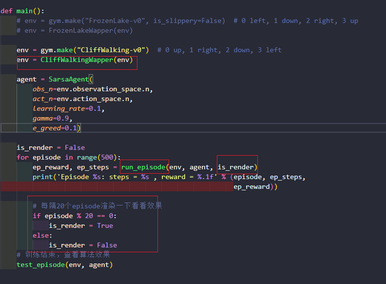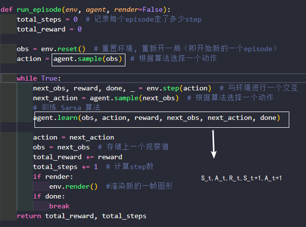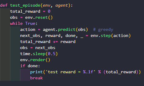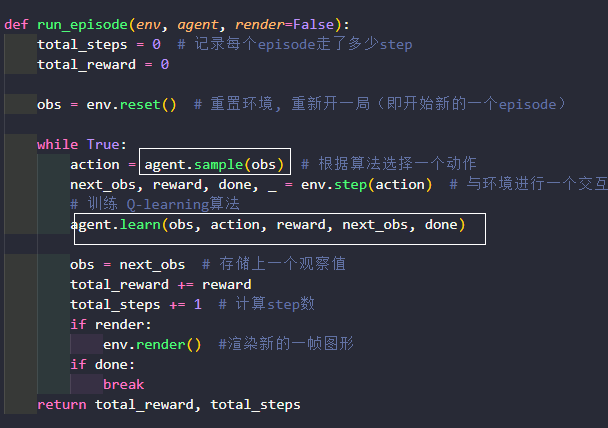run_episode():agent在一个episode中训练的过程,使用agent.sample()与环境交互,使用agent.learn()训练Q表格。test_episode():agent在一个episode中测试效果,评估目前的agent能在一个episode中拿到多少总reward。