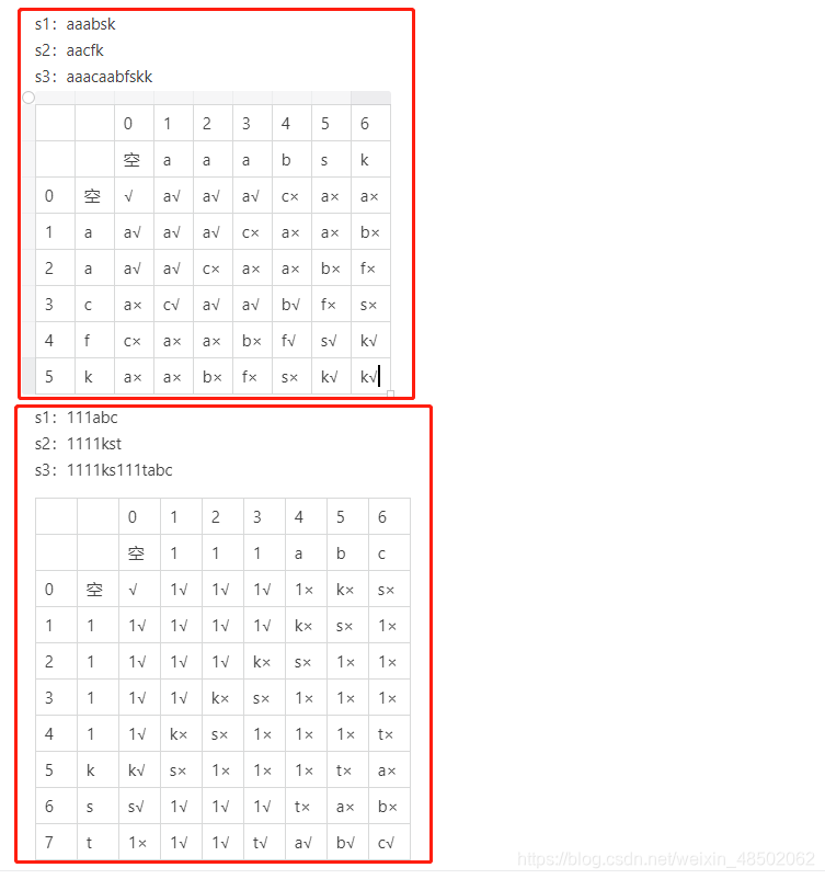 根据下面的动态规划表格可以看出规律:左对看上等,上对看左等。