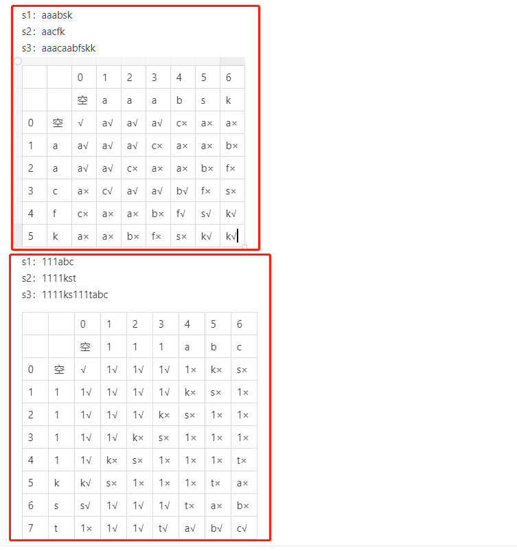 根据下面的动态规划表格可以看出规律:左对看上等,上对看左等。
