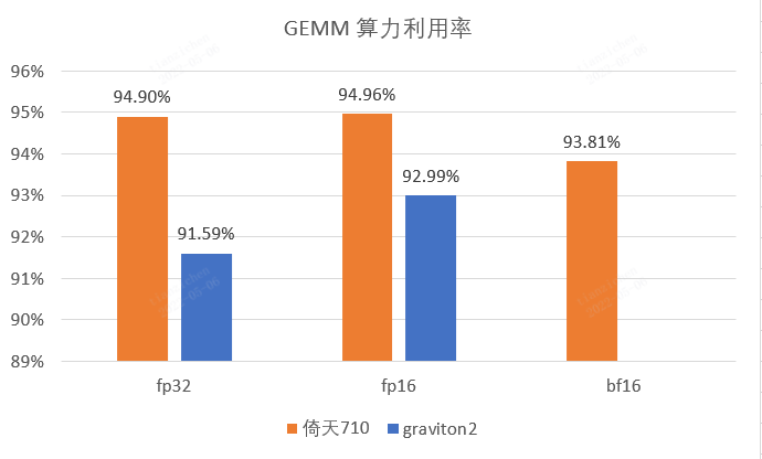 测试矩阵尺寸为 M x N x K = 1024 x 1152 x 1024,测试计算精度为 fp32、fp16、bf16 (输入输出格式为 fp16)。测试单核性能。