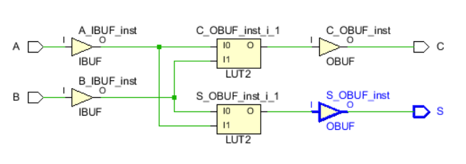 - 从④我们可以看到,该模块使用了2个LUT,2个输入缓冲区(Input-Buff)A一个,B一个,和两个输出缓冲区(Output-Buff)S一个,C一个。