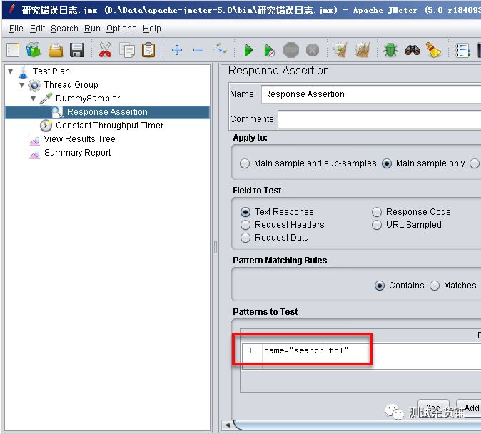 比如下面这个简单的脚本,我们使用了Response Assertion断言来判断响应报文里面是否有name="searchBtn1"。