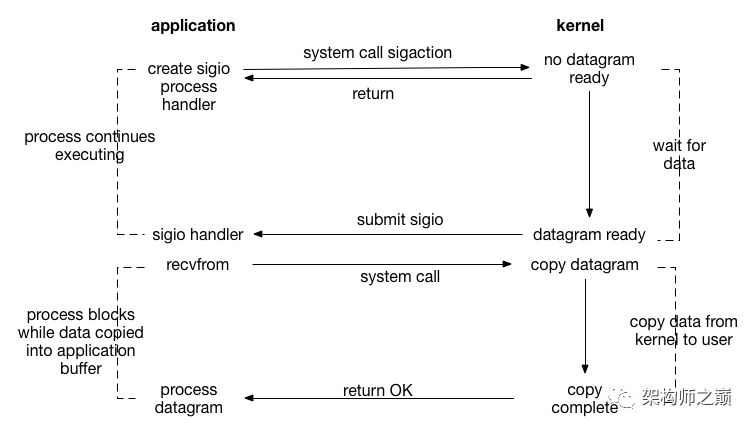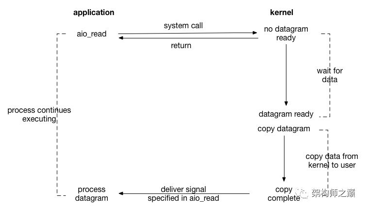 对比信号驱动IO,异步IO的主要区别在于:信号驱动由内核告诉我们何时可以开始一个IO操作(数据在内核缓冲区中),而异步IO则由内核通知IO操作何时已经完成(数据已经在用户空间中)。