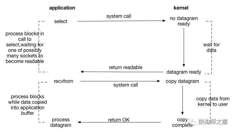 接着上面的列子,你点一份饭然后循环的去问好没好显然有点得不偿失,还不如就等在那里直到准备好,但是当你点了好几样饭菜的时候,你每次都去问一下所有饭菜的状态(未做好/已做好)肯定比你每次阻塞在那里等着好多了。当然,你问的时候是需要阻塞的,一直到有准备好的饭菜或者你等的不耐烦(超时)。这就引出了IO复用,也叫多路IO就绪通知。这是一种进程预先告知内核的能力,让内核发现进程指定的一个或多个IO条件就绪了,就通知进程。使得一个进程能在一连串的事件上等待。