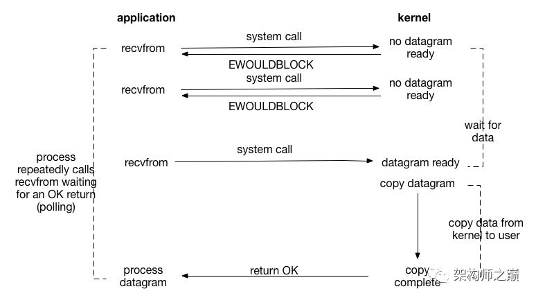 这种方式在编程中对socket设置O_NONBLOCK即可。但此方式仅仅针对网络IO有效,对磁盘IO并没有作用。因为本地文件IO就没有被认为是阻塞,我们所说的网络IO的阻塞是因为网路IO有无限阻塞的可能,而本地文件除非是被锁住,否则是不可能无限阻塞的,因此只有锁这种情况下,O_NONBLOCK才会有作用。而且,磁盘IO时要么数据在内核缓冲区中直接可以返回,要么需要调用物理设备去读取,这时候进程的其他工作都需要等待。因此,后续的IO复用和信号驱动IO对文件IO也是没有意义的。
