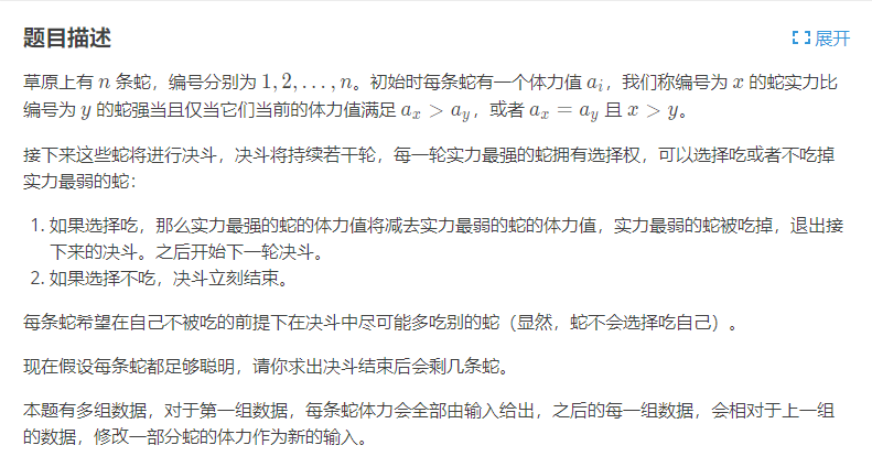 好了,正解思路已经出来了,数组模拟两个单调队列,每次找两个队列头部最大的和尾部最小的这两条蛇,战胜的新蛇能放A队尾就放A队尾,否则放B队尾。