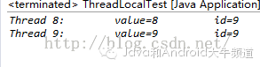 上面代码展示了ThreadLocal的基本用法。定义了2个类变量mThreadLocal和id,一个成员方法printValue用来打印mThreadLocal和id的值,定义一个PrintValueRunnable在run方法中会先new一个ThreadLocalTest的实例,然后调用printValue来打印值。最后在main函数里面,创建两个线程,在线程里面执行PrintValueRunnable来执行打印任务。在ThreadLocalTest因为mThreadLocal和id都是类成员变量,所以在两个线程中都可以访问。在ThreadLocalTest的构造函数中会分别将线程id保存到mThreadLocal和id中。下面先看一下打印结果: