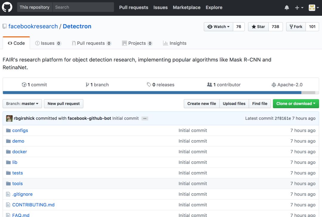 截至量子位发稿,Detectron在GitHub上放出7小时,已经收获738颗星标、101次Fork。