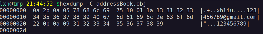 /tmp/目录下发现一个名为addressBook.obj的二进制文件,这个对象就是通过 ProtoBuf 序列化之后二进制数据,此时使用hexdump命令再加上-C选项,可以大致查看一下文件的内容,具体如下图所示: