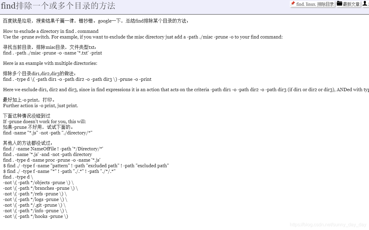 百度就是垃圾,搜索结果千篇一律,错抄错。google一下,总结find排除某个目录的方法: