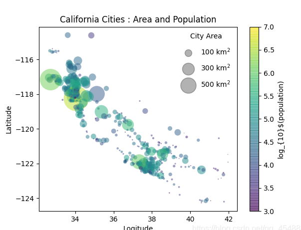 下面我们将以加利福尼亚州所有城市的数据(提取码666)为例来绘图,最终效果是将绘制出各个城市的位置,同时以城市面积大小来使用不同大小的圆表示