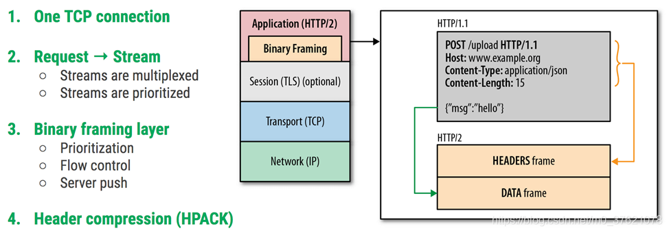 前面已经简单介绍过HTTP/2 相比HTTP/1.1 比较重要的几个特性:二进制帧层、多数据流并发、Header 压缩、服务端推送等,下面分别对其介绍。