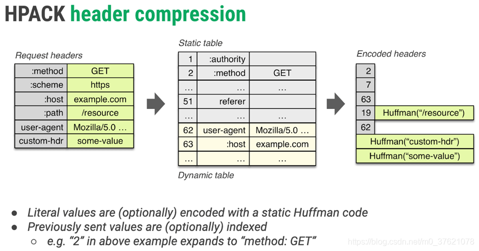 为了保证header 字段的索引值能正确解码,客户端与服务器端的header 字段列表索引映射关系应该完全一致。为了进一步降低header 字段的传输开销,这些 header 字段表可以在编码或解码新 header 字段时进行增量更新,新的header 字段采用Huffman 编码(摩斯电码就采用了霍夫曼编码)可以进一步降低编码后的字节数。