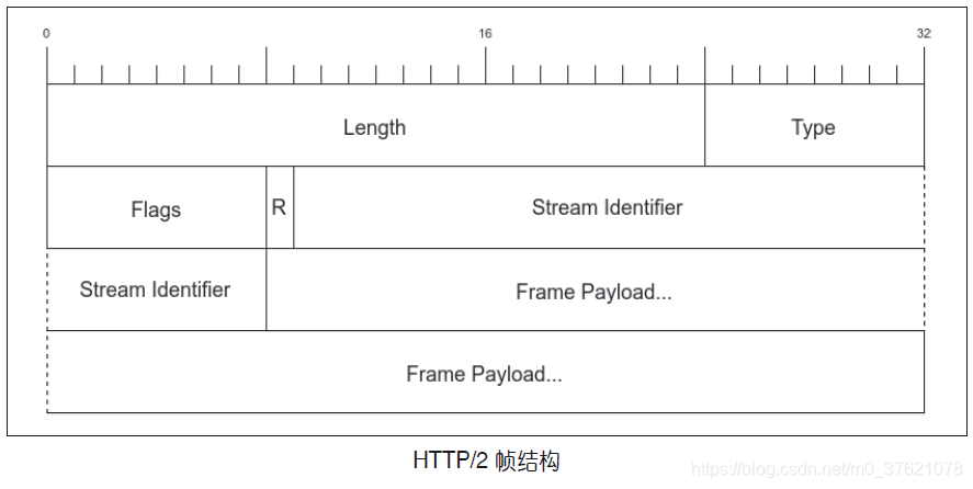 | Length | 3字节 | 表示帧负载的长度(取值范围为214 ~ 224-1 字节), 值得注意的是,214 字节是默认的最大帧大小, 如果需要更大的帧,可在SETTINGS 帧中设置 |