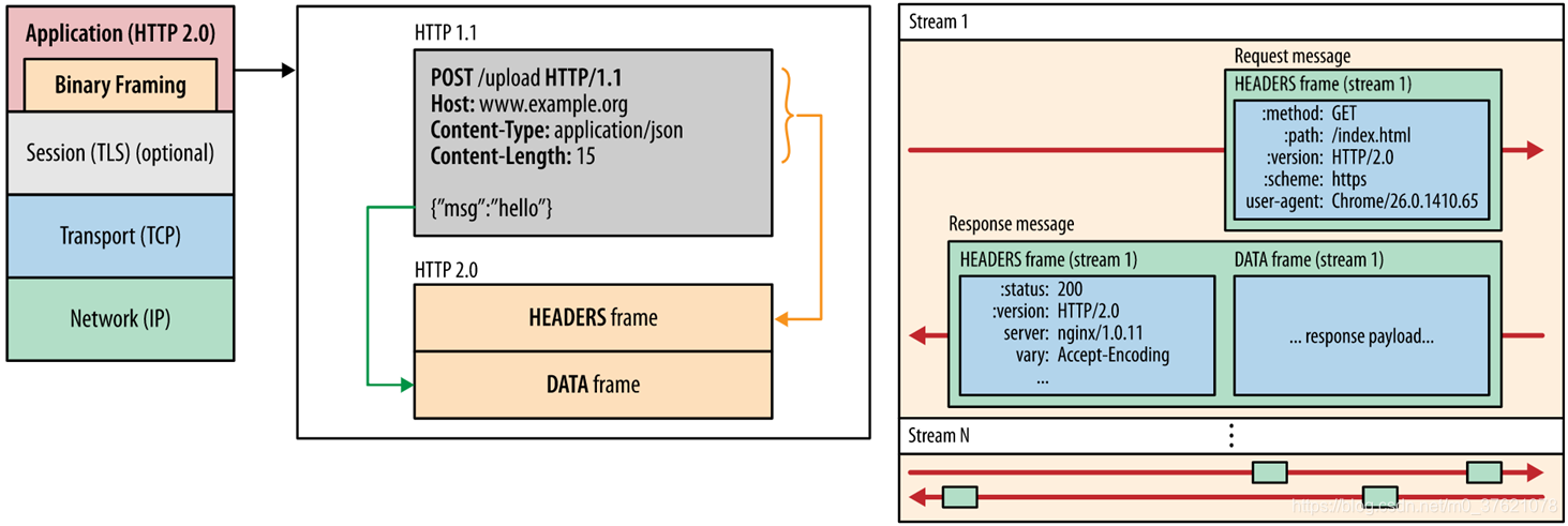 可以说,HTTP/2 所有性能增强的核心在于新的二进制分帧层,它定义了如何封装 HTTP 消息并在客户端与服务器之间传输。这里所谓的“层”,指的是位于套接字接口与应用可见的高级 HTTP API 之间一个经过优化的新编码机制:HTTP 的语义(包括各种动词、方法、标头)都不受影响,不同的是传输期间对它们的编码方式变了。 HTTP/1.x 协议以换行符作为纯文本的分隔符,而 HTTP/2 将所有传输的信息分割为更小的消息和帧,并采用二进制格式对它们编码。